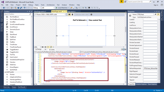 - <Controls:PullToRefreshListView x:Name="PTRLVtest" HorizontalAlignment="Left" VerticalAlignment="Top" Margin="136,126,0,0" Width="407" Height="189" RefreshRequested="PTRLVtest_RefreshRequested">