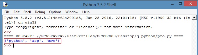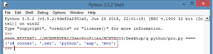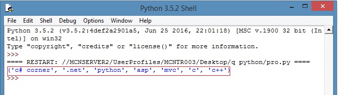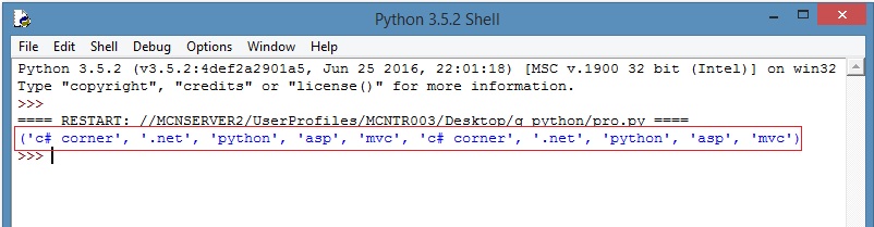 Question 19: What is the output of print(tuple) if tuple = ("c# corner",".net","python","asp","mvc")?