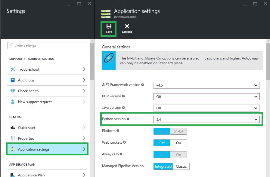 In the Web app blade, click Settings, then Click Application settings and choose the desired Python version and Click Save. Within a few moments, your java web app will be ready for use After that click the URL to browse to the new site. The web page confirms that you have created a Python-based web app.