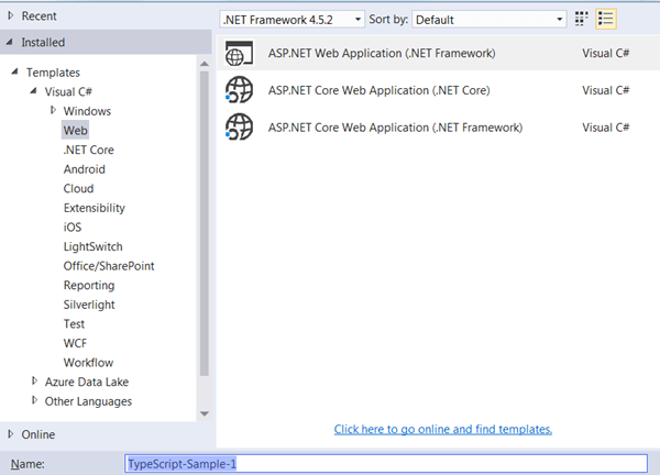 - Open VS 2015 and create a project named as “TypeScript-Sample-1” and choose empty template.