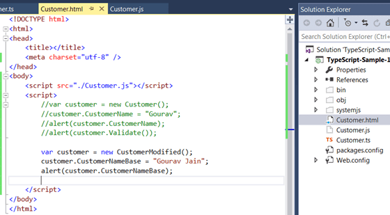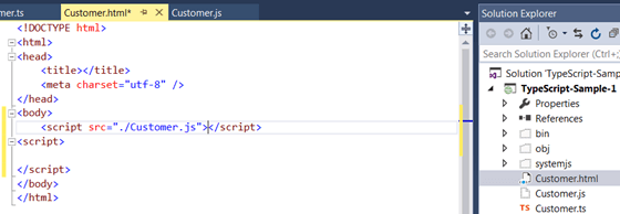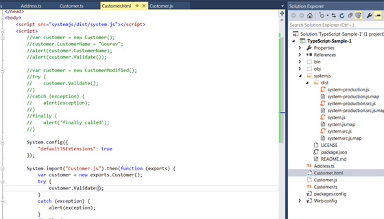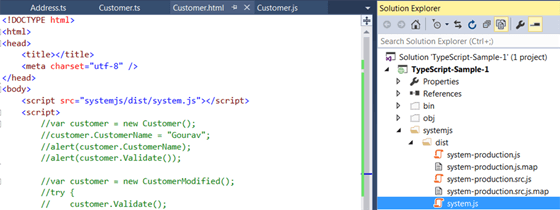 — Write some code in HTML script tag to use SystemJS package and call the Customer class object. Internally address the object property as well.