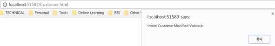 — Incorporate the exception in the JS file with the "throw" keyword in CustomerModified Validate method.