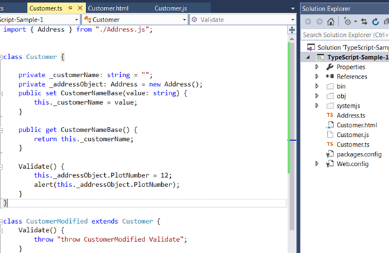 — Import the Address class into Customer class and use its property into the validate method and show in the alert.