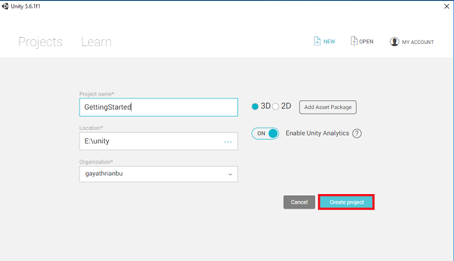 In the Unity Environment, select New Project and give the project name as Gettingstarted. And then, choose the Location to save the project. Select 3D or 2D. I select 3D then click "Create project".