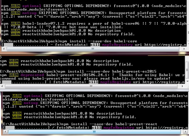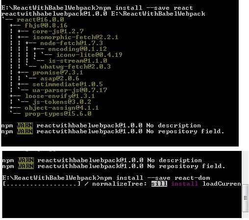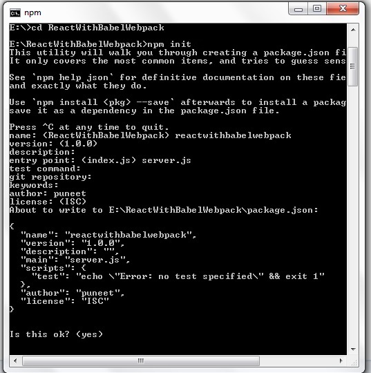 The first step is to Create a new folder, ReactWithBabelWebpack, and right click on Folder and Git Bash here or navigate to folder and run npm init command. After that package.json file is created in our application.