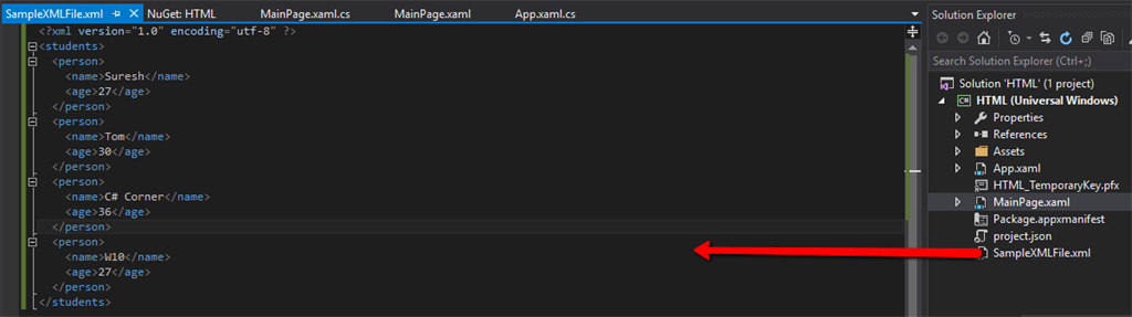 Create new Windows 10 app and add the XML file that you want to read, here I add the following xml file to load the student’s details.