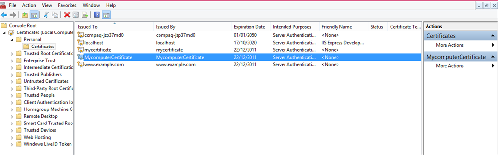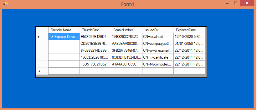 Now, as you see, my Personal folder has the following certificate. Now, I want to read the certificate details. To show the details, I have the following snapshot with a Gridview: