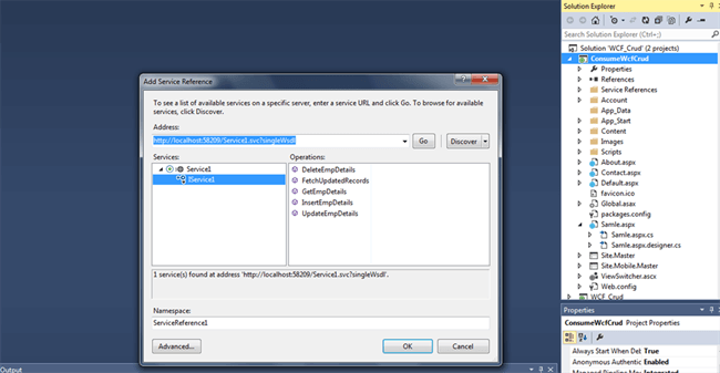 Change the namespace ServiceReference1 to WcfCrudRef or you can use your own namespace. Then, click on the OK button.