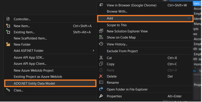 folder, select Add -> ADO.NET Entity Data Model or select Add->New Item. In