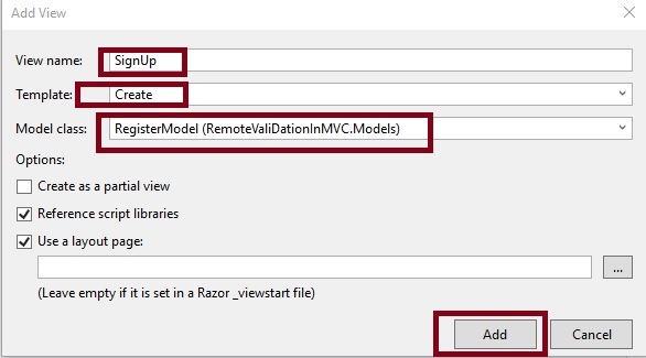 Now, let's create StronglyTyped View named SignUp from RegisterModel class.