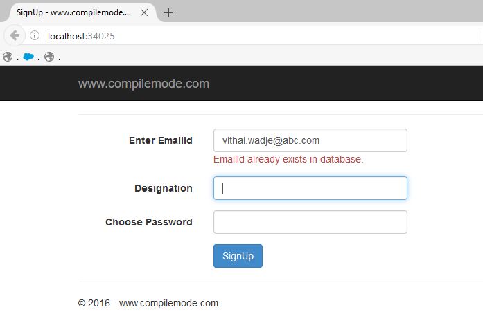 Now, without posting the form, it's showing instantly that the given email id already exists in the database, This approach will save a lot of time for the user in unnecessary validation.