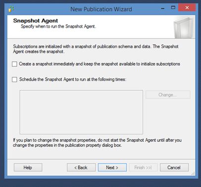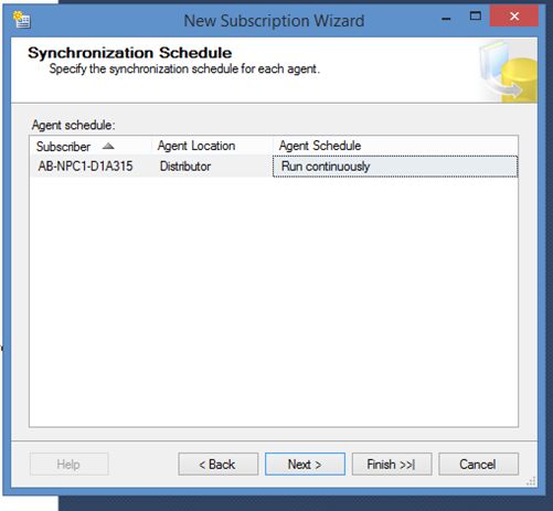 Now, it’s asking agent to run continuously, run on demand or schedule it. This depends on your business requirements how you want your data. Here I am continuing with default selection run continuously. ->click Next ->Run immediately ->Create the subscription -> Finish.