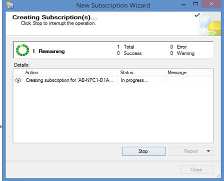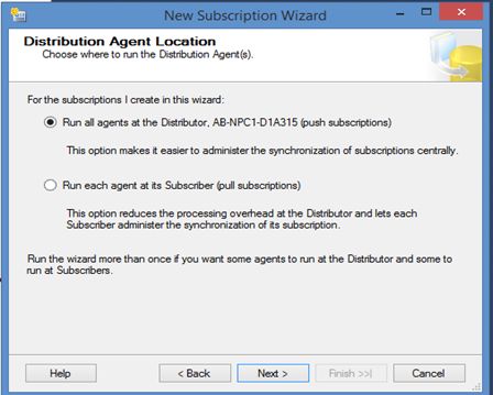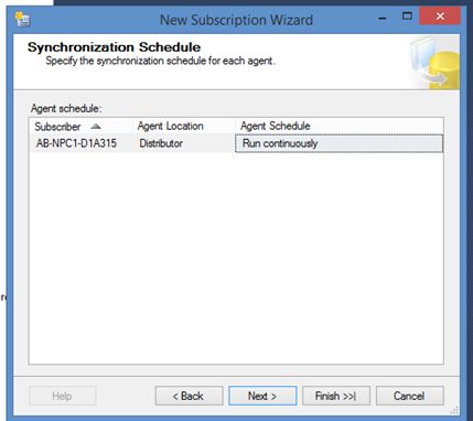 Now,it’s asking agent to run continuously, run on demand or schedule it. This depends on your business requirements, how you want your data. Here am continuing with default selection running continuously. ->click Next ->Run immediately ->Create the subscription -> Finish