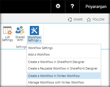 Let’s go ahead to the primary list, where we will be running our Nintex Workflow. In our case, it is the ‘User Profile’ List. Select ‘Create a Workflow in Nintex Workflow’.
