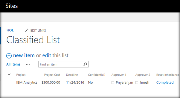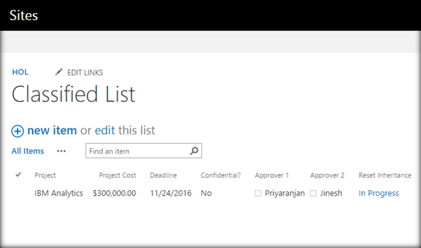 In this article, we will see how to reset permission inheritance of a List Item in a SharePoint List, using Nintex Workflow. We will be maintaining a List ‘Classified List’ within which we will maintain the list data. Based on the Column Value “Confidential?”, we will use Nintex Workflow to define inheritance of the list item.