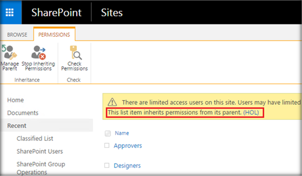 On checking the list item permissions, we can see that it inherits the permission from the parent.