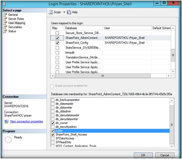 SharePoint Management Shell is the Swiss Army Knife in any SharePoint developer's/administrator's pocket. However when we run SharePoint Management Shell for the first time we might stumble upon a couple of issues if proper rights are not provided. In this article we will see some of the common permission issues related to setting up SharePoint Management Shell. Let's try to spin up SharePoint 2016 Management Shell from the SharePoint Server. I am running the management shell as a different user (Select “Run as different user”) who has been assigned permission recently. This occurs because the login user name you had given is not assigned to the user policy “Allow log on locally”. This policy setting can be accessed through Start->Administrative Tools->Local Security Policy. Navigate to Local Policies->User Rights Assignment->Allow Log On Locally. In order to assign this policy setting to the user you can either add the user to any of the below groups or add the user directly. Another alternative is you can run the 2016 Management Shell as Administrators shown below. Click on Run as administrator. This would run the SharePoint 2016 Management Shell with Administrative group rights. Thus we are able to log in to the SharePoint 2016 management shell. However we have got an error “The local farm is not accessible”. This is because the user does not have access to Config DB and does not have adequate Shell admin rights, and as a result we won’t be able to access SharePoint Object Model. We will have to provide the required permissions from SQL Server. Spin up SQL Server Management Studio. Go to Security tab and open up the properties window of the user. Assign db_owner and SharePoint_Shell_Access rights to the below DBs,