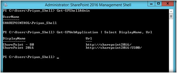 Once you have given the access in SQL Server to the above databases, open SharePoint 2016 Management Shell in administrator mode again. This time it opens up without any error messages. Let’s run some PS scripts to see it in action. We have executed PS Scripts to list our Shell admin and web applications in the farm which has produced the above results. Assigning the proper permission in SharePoint Server and SQL Server is the key to get SharePoint Management Shell running without any issues. Once it is done we can access SharePoint object model without any hassle.