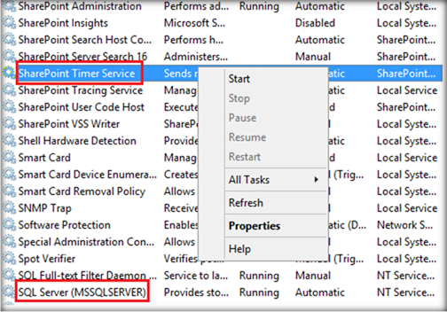 This seemed to be a farm wide issue and I was left without many options. Then, I had to start debugging in order to find the root cause of the issue. First thing to check was to ensure if all the Services related to SharePoint and MS SQL Server were up and running.