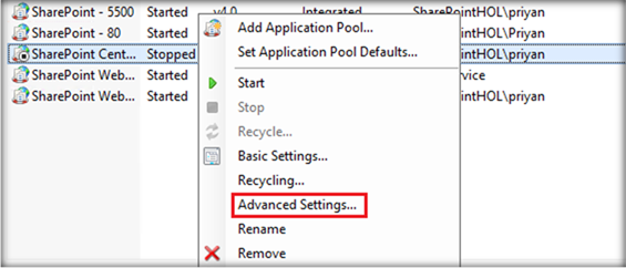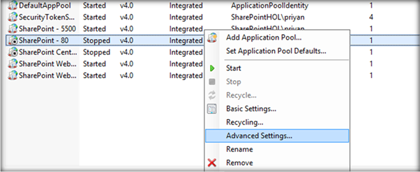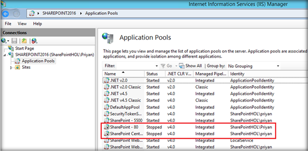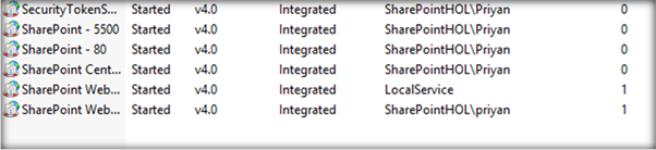 This time, the application pool for the web application has started. Now, do the same for the Central Administration Web application pool, as well.