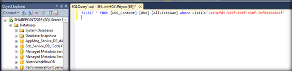 - SELECT * FROM [ContentDB Name].[dbo].[AllListsAux] where ListID=’GUID of List'