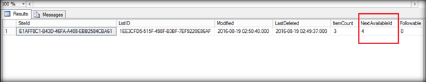 - UPDATE [WSS_Content].dbo.AllListsAux set NextAvailableId=1 where ListID='1ee3cfd5-515f-498f-b3bf-7ef9220e86af'