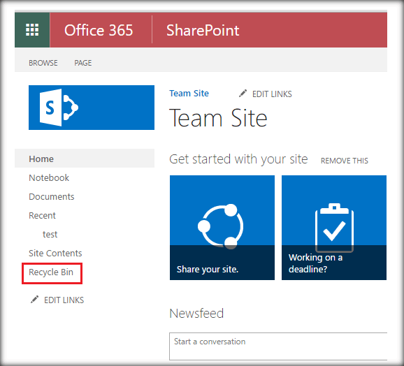 Let’s go ahead and delete it. It will be moved to the recycle bin. We can spot the recycle bin in the quick launch.