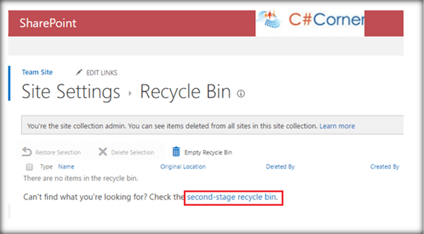 You can go to the second stage recycle bin by either appending ‘_layouts/15/AdminRecycleBin.aspx?View=2&ql=1’ to the existing URL in the address bar of the browser or by clicking on the link shown in the below diagram.