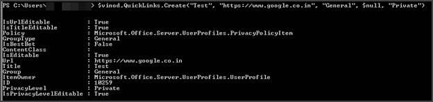 - $User.QuickLinks.Create("Test", "https://www.google.co.in", "General", $null, "Private")