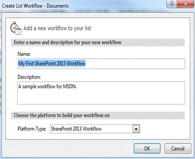 - Enter the basic details. Create List Workflow dialog box and then make sure that the platform type is set to SharePoint 2013 Workflow.