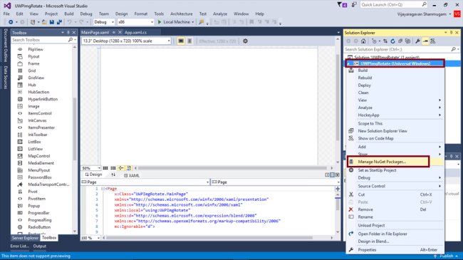 To add the reference, right click on your project (UWPImgRotate) and select Manage NuGet Packages.