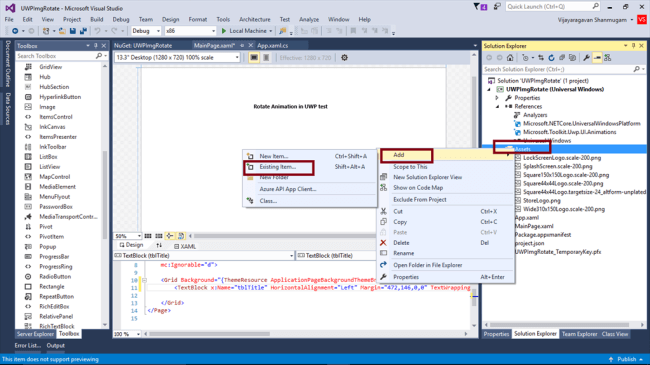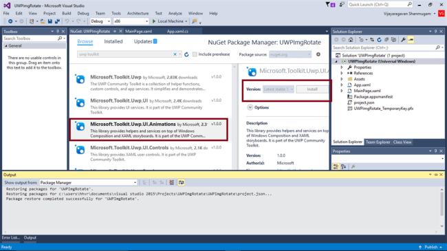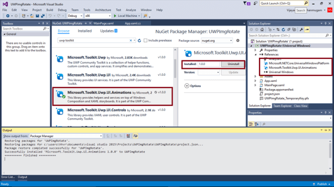 Step 2 - Open (double click) the file MainPage.xaml in Solution Explorer and add Microsoft.Toolkit.Uwp.UI.Animations reference in the project.