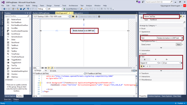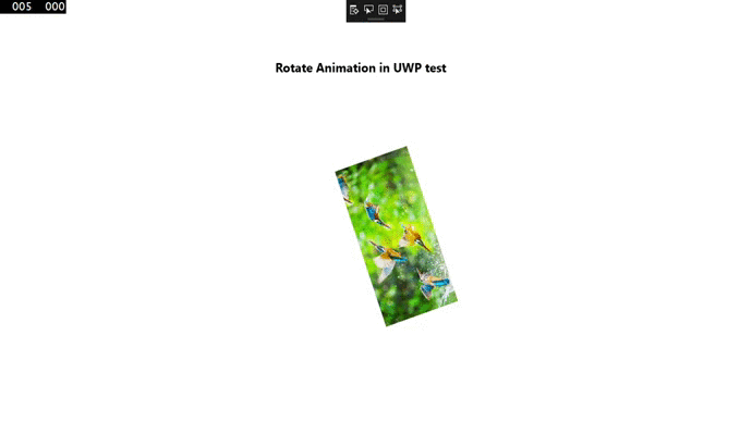 - <TextBlock x:Name="tblTitle" HorizontalAlignment="Left" Margin="500,102,0,0" TextWrapping="Wrap" Text="Rotate Animation in UWP test" VerticalAlignment="Top" Height="34" Width="314" FontWeight="Bold" FontSize="22" />