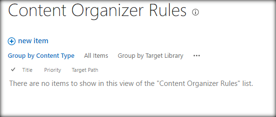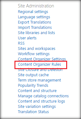 Once the document is created, ensure that we have the Content Organizer Rules section in Site Settings-> Site Administration.