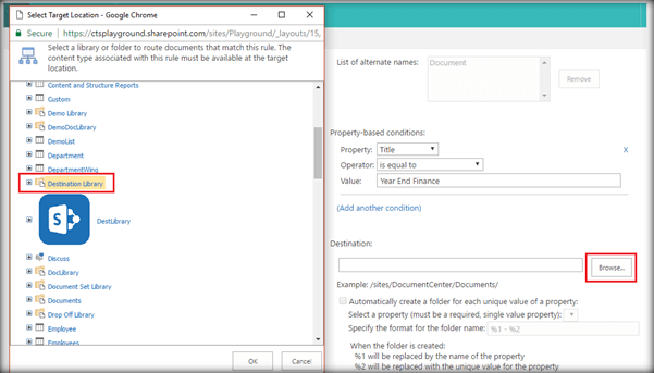 Finally, we have to set the target location where the document has to be routed to. Select "Browse" and set the destination library.