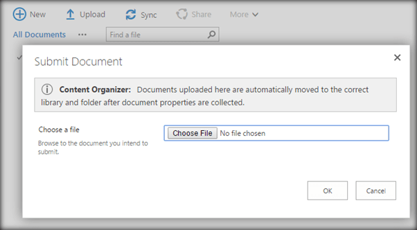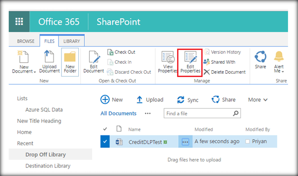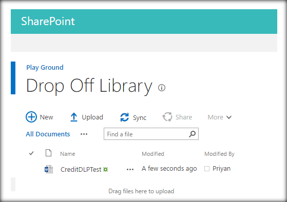Now, let’s test the document routing capability. Go to the Drop Off library that gets created when we activate the Content Organizer Site feature, and upload a document here.