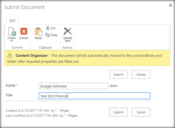 We get the message that the document has been submitted successfully but it has not been routed to the destination library as no Content Organizer Rule was matched. This is because the metadata Title is not set to ‘Year End Finance’.