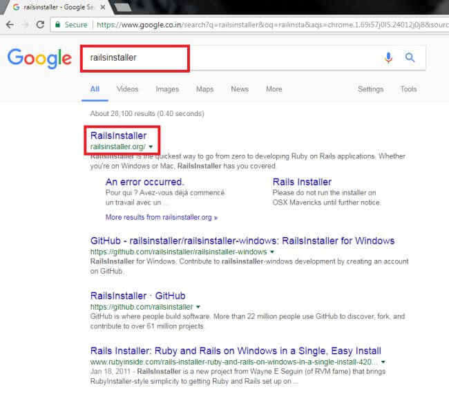 First open any web browser (mine is Google chrome) to search RailsInstaller and open RailsInstaller.org official page.