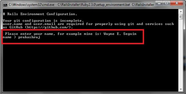 When you click the Finish button automatically open the Rails environment configuration command prompt; it requires completion of Git configuration. Enter the username (your name) it will give an example above the current line.
