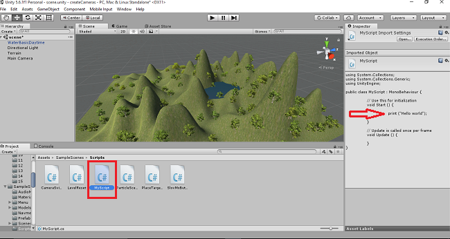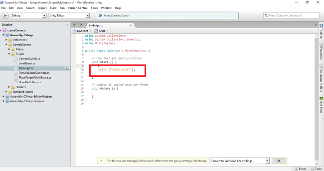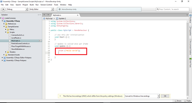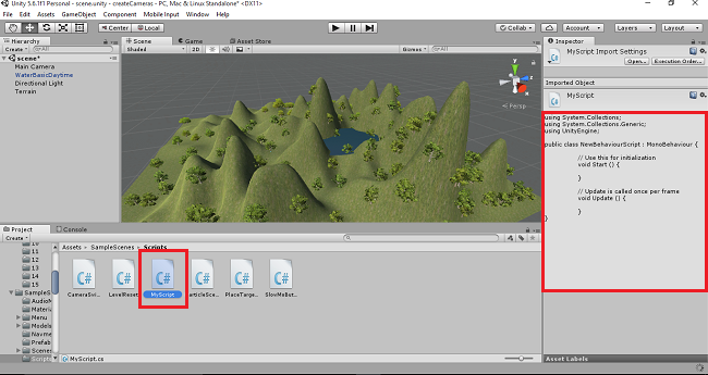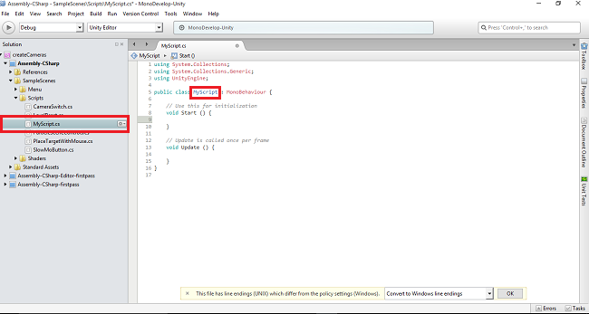 The C# scripts will be added into the scripts folder. Rename the script as MyScript. The default coding will be displayed in the right side.