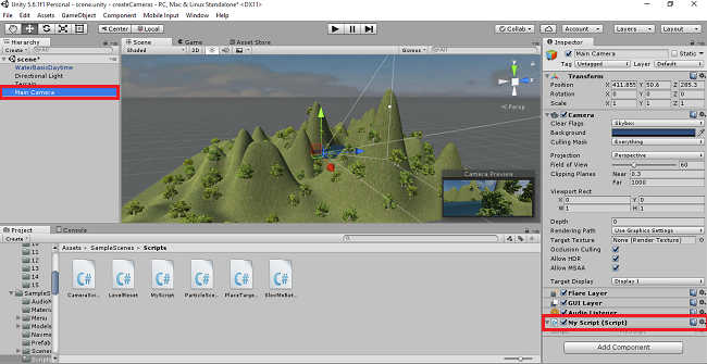 Click on the Main camera. The MyScript will be added in the Inspector window.