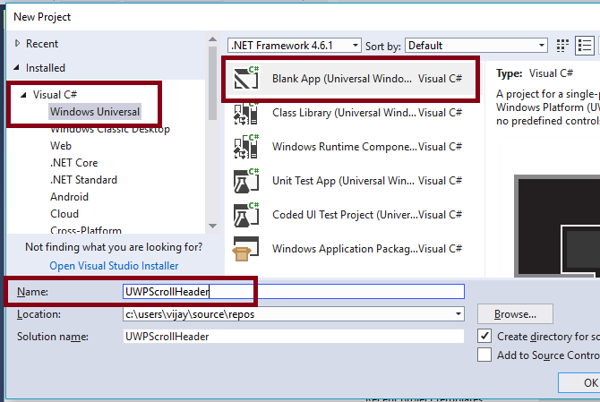 Open Visual Studio 2017 and go to Start -> New Project -> Windows Universal (under Visual C#) -> Blank App(Universal Windows). Give a suitable name for your app (UWPScrollHeader) and click OK.