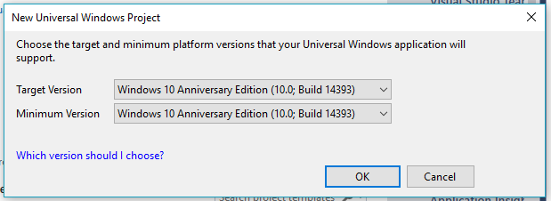 After choosing the target and minimum platform versions that your Windows Universal Application will support (Windows Anniversary Update (10.0.14393.0)), the project creates App.xaml and MainPage.xaml.