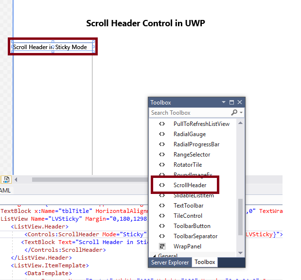 Add the following controls in design window for ScrollHeader control view. Add a TextBlock Control and change the Name and Text property.