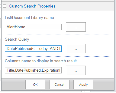 | DatePublished<=Today AND ExpirationDate>=Today | Columns name to display in search result | Title,Status |