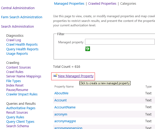 - In New Managed Property window, add the Property name, Description, type of information in this property, check searchable, check Queryable, check retrievable.