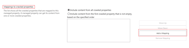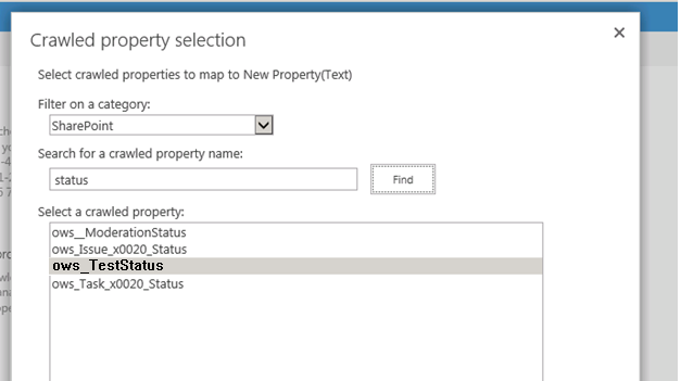 - In Crawled property selection window, select SharePoint from Filter on a category dropdown list. Search a crawled property that you want to map with. Select the property and click OK. Click OK again from the main window.