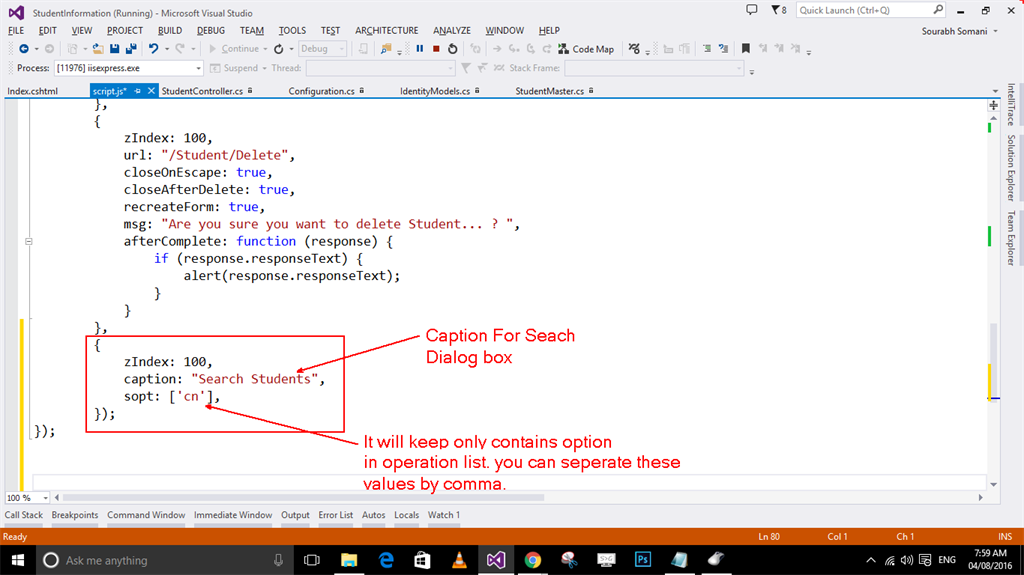 - Now modify search dialog box by writing code just after delete operation in script.js.