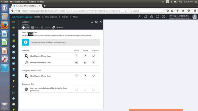 Click on "Add" option in the "Access" panel of Azure Data Lake Store account.