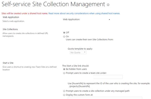 Once you configure, the settings will be applied on the web application and the self – service site creation will work as expected